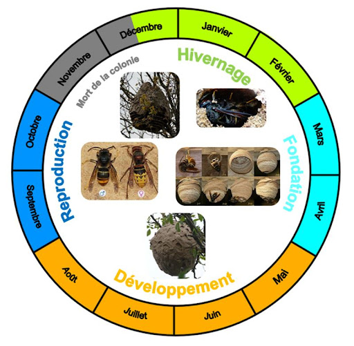 Le cycle de vie du frelon asiatique (Vespa velutina) est annuel et se déroule en plusieurs phases :