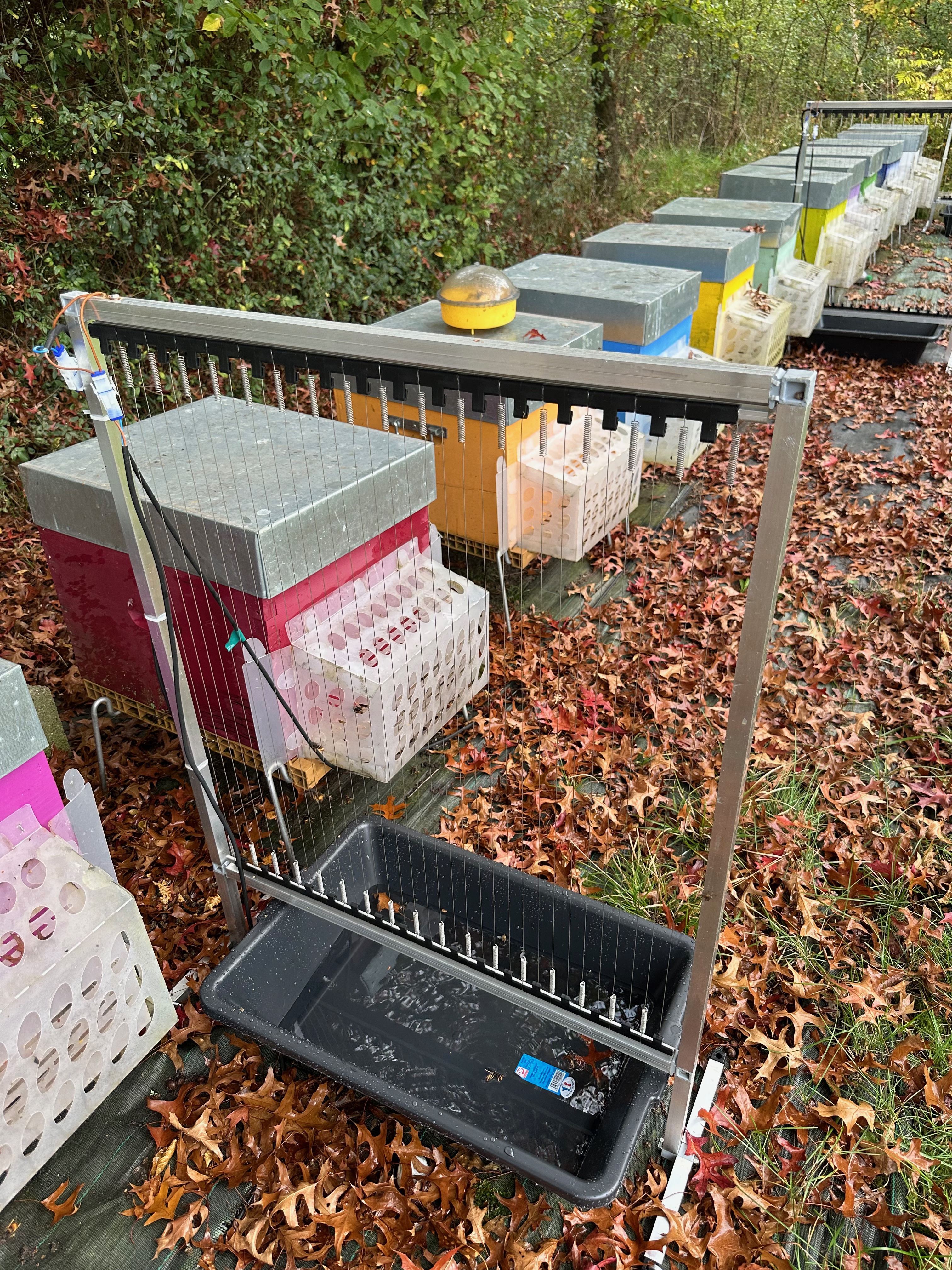 Pus tard dans la saison, il est absolument indispensable de protéger les ruches en installant des muselières et des harpes électriques, les premières pour réduire le stress des abeilles et leur permettre ainsi de sortir et ramener de la nourriture à la colonie, les secondes pour limiter le nombre de frelons.