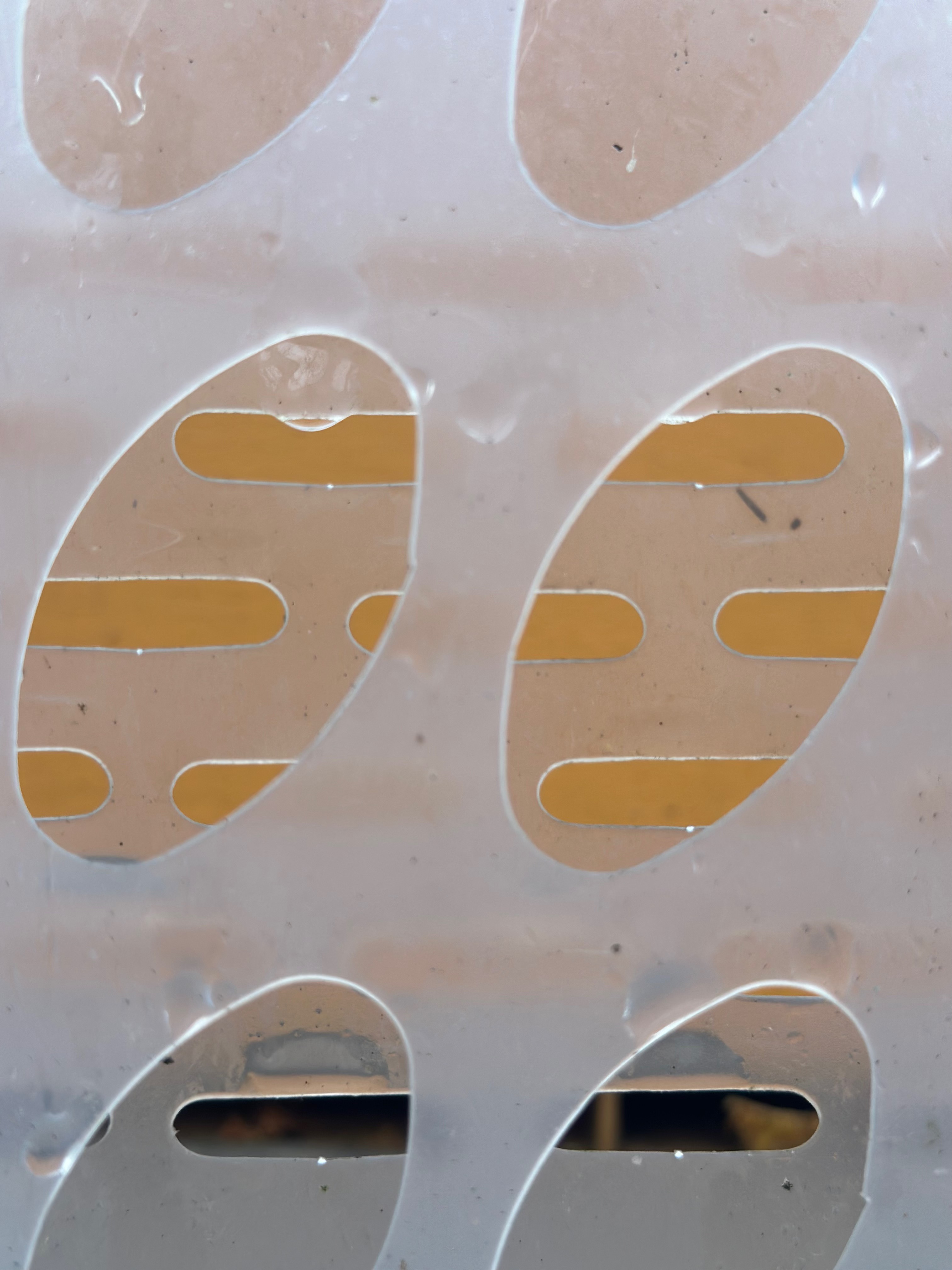 - Description: Muselières en plastique transparent double paroi avec des ouvertures ovales à l’extérieur qui permettent un retour rapide aux abeilles et des trous beaucoup plus petits à l’intérieur qui empêchent les frelons de passer.
